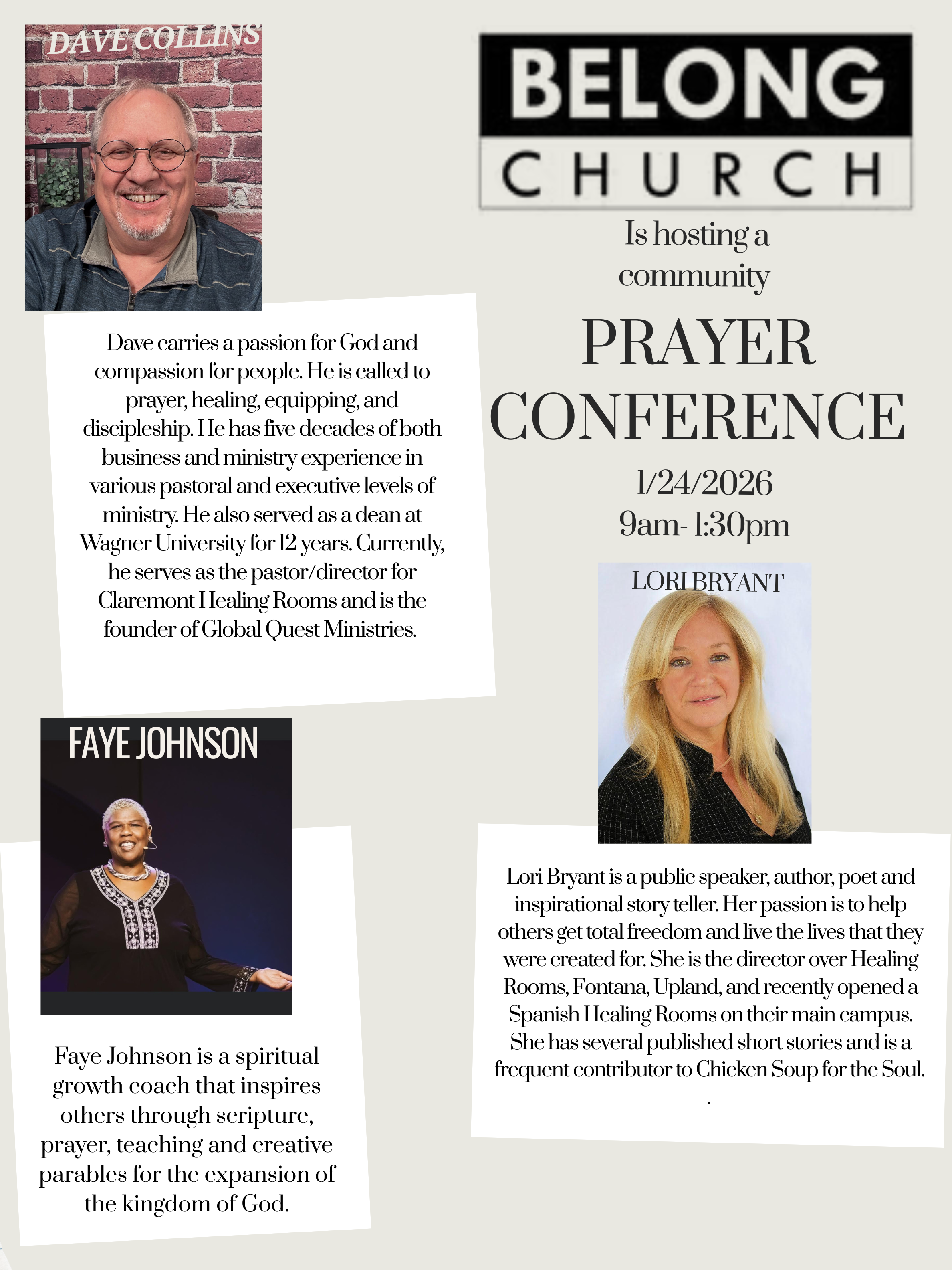 Belong Church is hosting a community prayer conference on January 24 (9:00 AM–1:30 PM). Join Dave Collins, Lori Bryant, and Faye Johnson for a Christ-centered morning of prayer, healing, and equipping. Come be encouraged, receive ministry, and grow in practical tools for intercession and freedom. All are welcome.